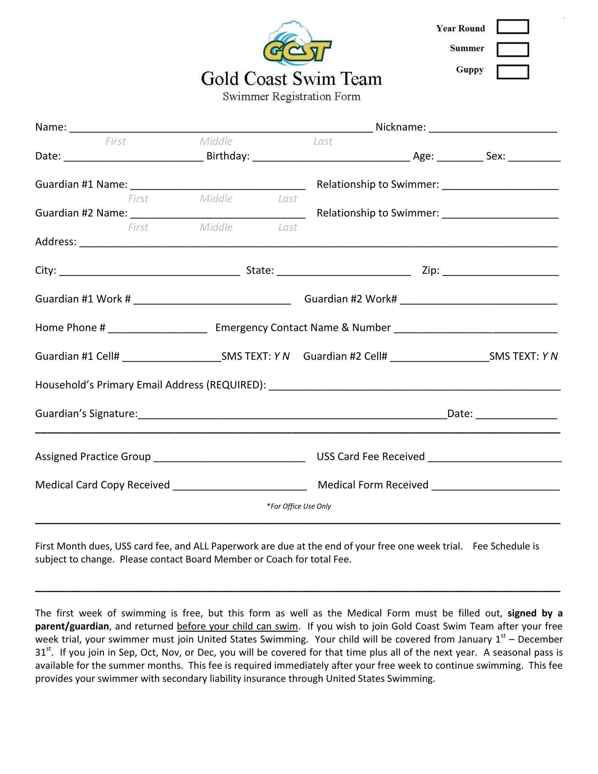 The benefits of children playing in youth sports include learning a new skill, learning life lessons, and being physically active. To facilitate our children realizing these benefits, it is important that we as parents play a role in supporting, helping, and assisting our child in the sports environment. Gold Coast Swim Team acknowledges the important part that parents play in the success of our team members and the team itself. We applaud you parents for creating our team members and helping them acheive their goals. One way that you can assist your child on his/her road to success is to actively participate in GCST through volunteering. Volunteering for GCST comes in many different forms; you can assist by becoming a Board Member and vote for and help set the course of the team and it's goals, or volunteer in the office helping with paperwork and bookkeeping associated with the team, as well as vlounteering during one of our Team Events such as a swim meet or outing. The best way to find out how to do any of these things is to contact our Board or your Coach for more information. (Contact Information located on the Contact Us Page). Below you will find commonly needed forms and publications. If you have any questions regarding any of these, please contact us. |
