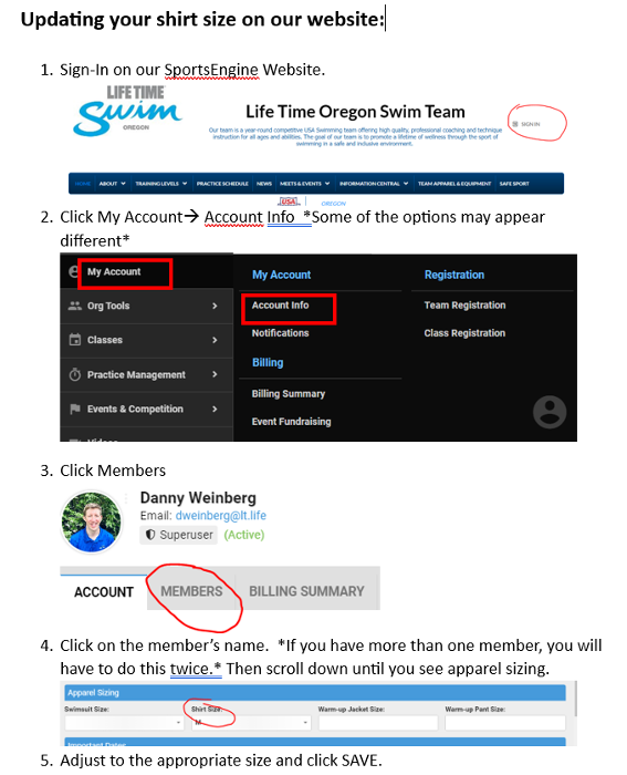 - Please log-in to our team website (SportsEngine) and update your swimmer’s shirt size. We plan on ordering T-shirts this month. I’ve attached screenshots of this for those who having difficulties.