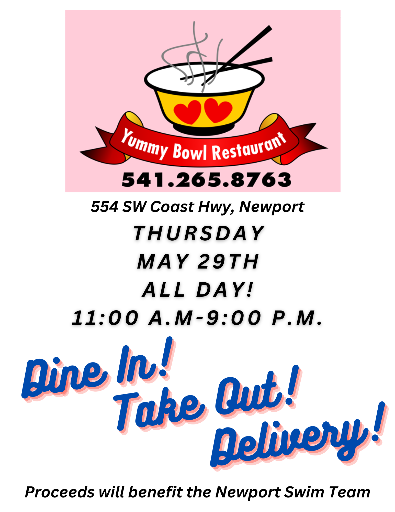 Yummy Bowl Dine Out-Thursday May 29th, all day 11:00 a.m.-9:00 p.m. Dine in! Take Out! Delivery!
