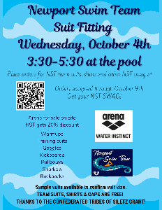 Hello! Thank you to all that attended the 2022-23 NST Awards event yesterday. Coach John Wray was surprised with the Newport Open home meet being renamed to the Wray Open to honor him. Starting today you can order NST Team Swag online! This includes a FREE Arena team suit and team shirt for every swimmer! Huge thanks to the Confederated Tribes of Siletz for the grant to make this possible. Team Suit Fitting is, next week, October 4th 3:30-5:30 at the pool. Sample suits available to confirm team suit size,...
