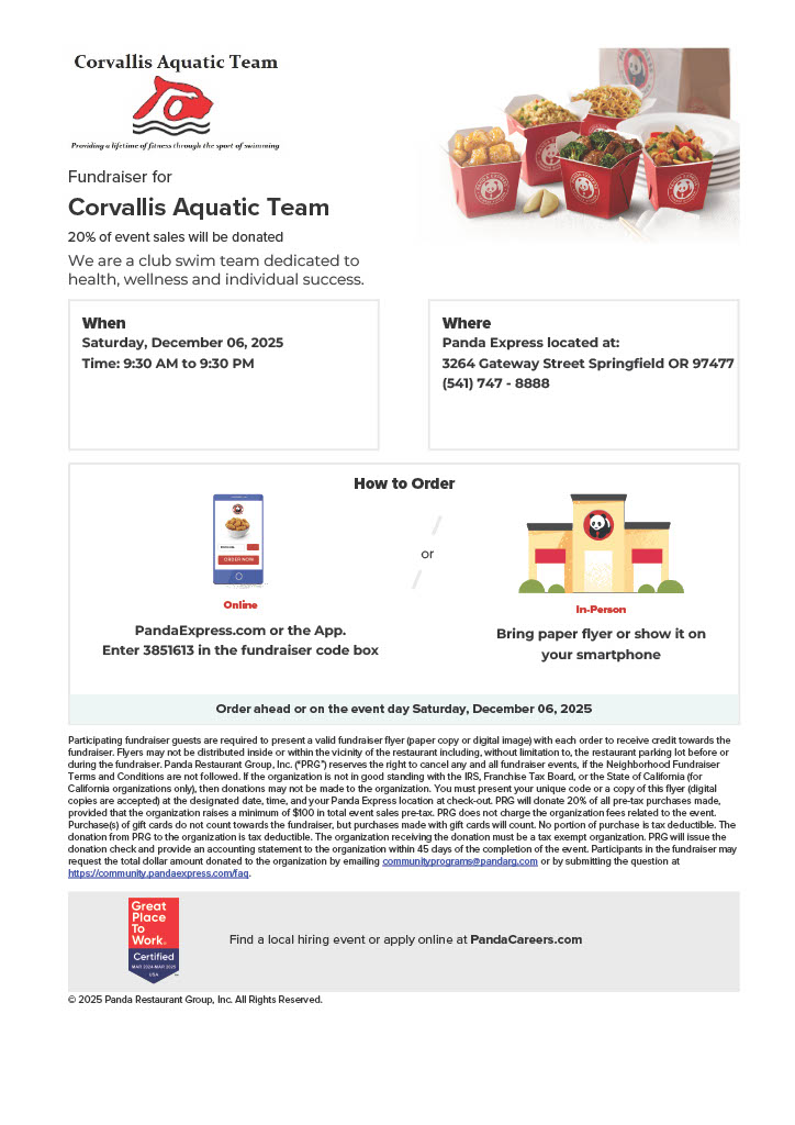 Present the flyers below (hard copy or on your phone) at local Springfield restaurants and support the Corvallis Aquatic Team!