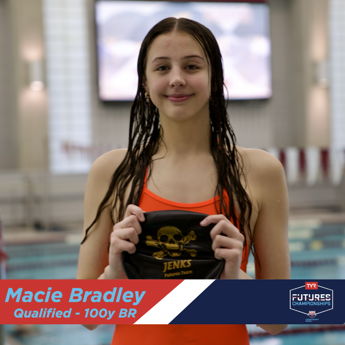 Congratulations to Macie Bradley on qualifying for the TYR Futures Championship and setting the Girls 15-16 JTSC record in the 100Y Breaststroke with a time of 1:05.44!