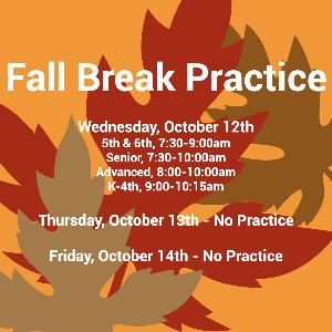 Fall Break Practice Schedule Monday - Regular Schedule Tuessday - Regular Schedule Wednesday 5th & 6th, 7:30-9:00am Senior, 7:30-10:00am Advanced, 8:00-10:00am K-4th, 9:00-10:15am Thursday - No Practice Friday - No Practice