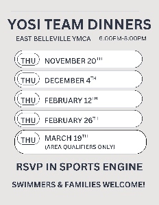 DINNER IS ON US!! YOSI Families, We’re excited to start a new YOSI tradition this season! Before each of our three-day meets, we’ll host a Team Dinner on the Thursday evening before the meet. Our first team dinner will be on Thursday, November 20th! Time: 6:00–8:00 PM Location: East Belleville YMCA You can RSVP directly through SportsEngine — look for the event listed under your swimmer’s calendar. Please “Declare” whether your family will attend, and if you select “Yes,” include in the text box how many total family members will...