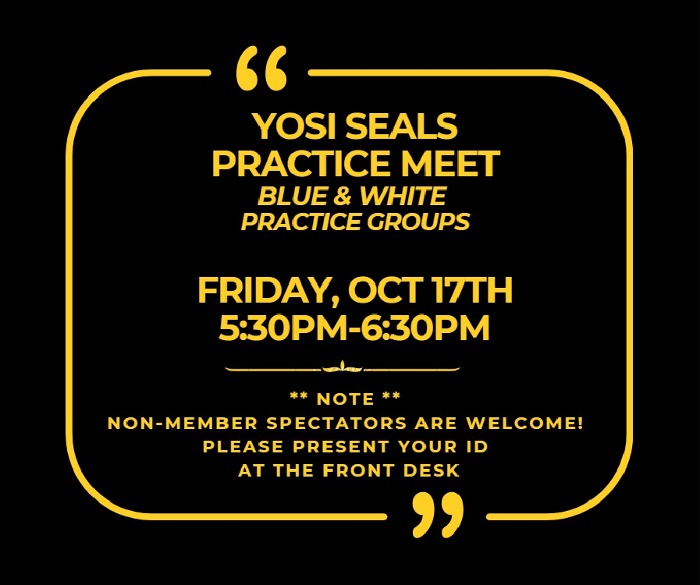 Just a reminder about our Practice Meet on Friday 10/17/25 for our White & Blue Practice Groups. 5:30pm-6:30pm