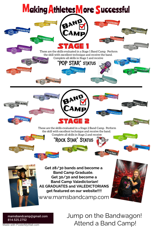 Band Camp is an instructional tumbling camp with a REWARD component. There are 2 stages of Band camp. Stage 1 is a camp centered around 15 skills. These skills fall under Level 1 and Level 2 skills in all star cheerleading. Stage 2 is a camp centered around 15 skills that fall under the Level 3 to Level 6 skills in all star cheerleading.