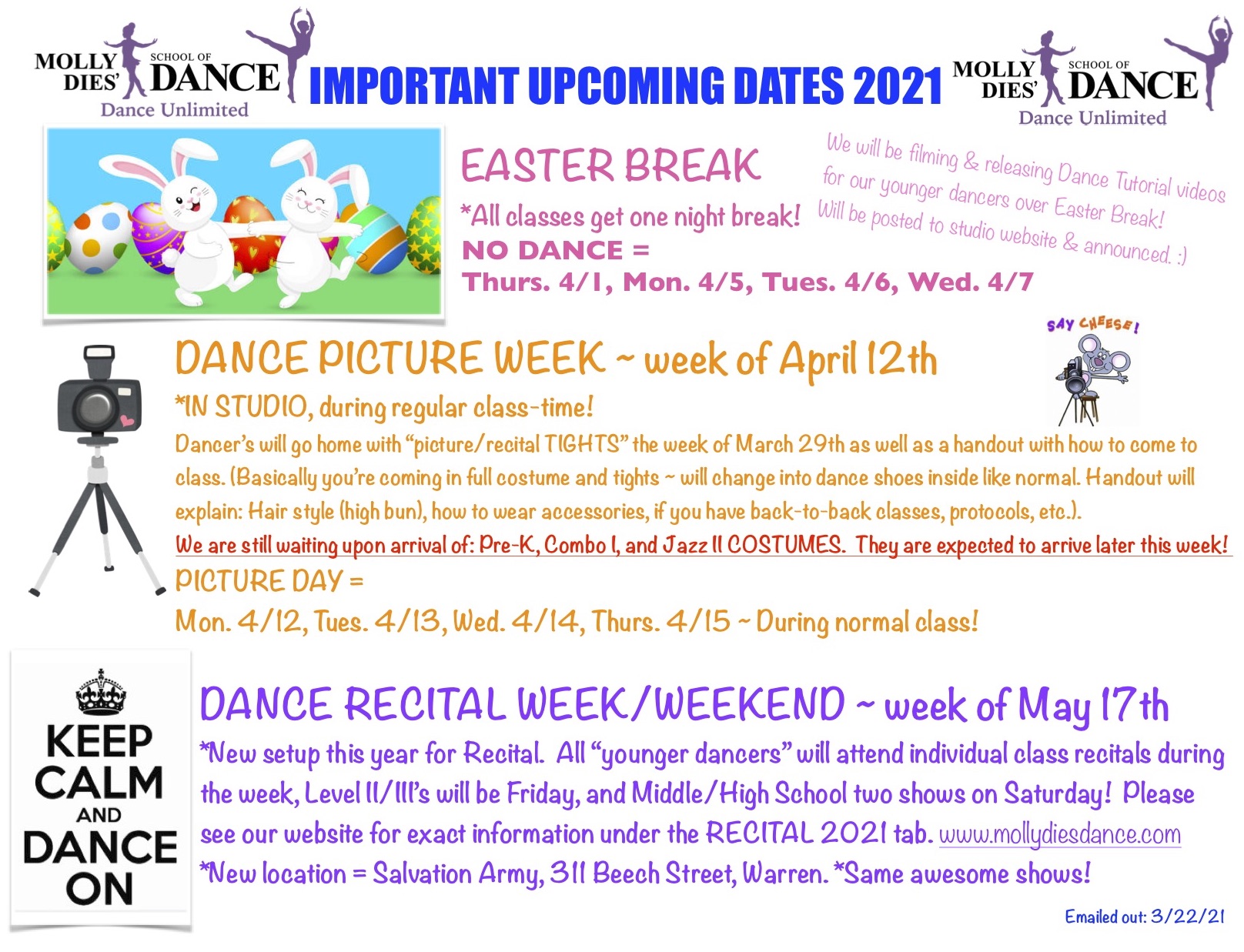 We only take off for "major" Holidays. If there is no school, we still have dance!! So YES there are dance classes on Energy Days, School Service Days, and sometimes even Snow Days! We will communicate these days through Text Blasts and Push Notifications!