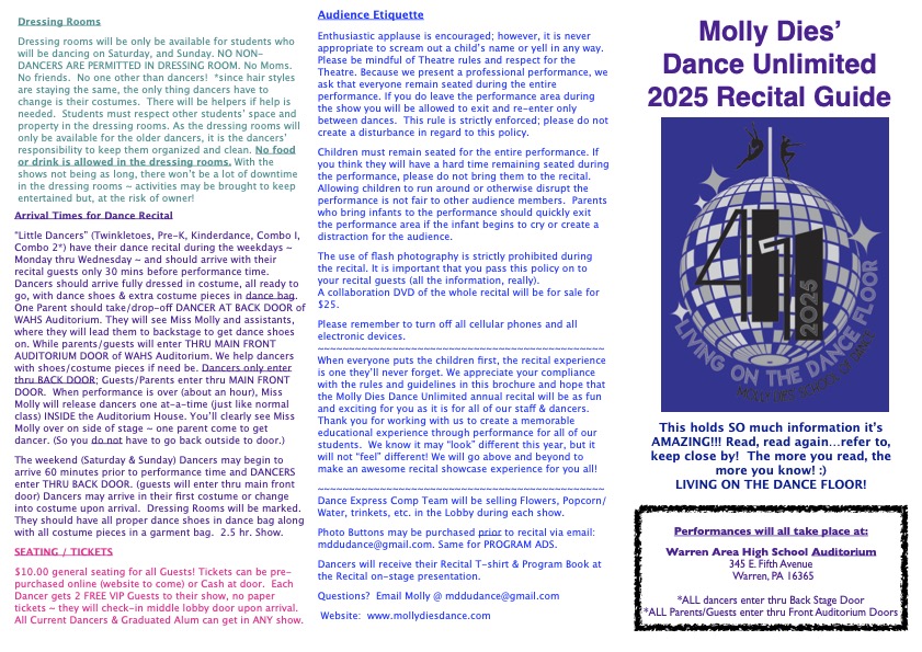 Brochure = handy-dandy in your fingertips brightly colored brochure sent home this past week, explains recital setup (attached in this email as well) If your dancer was absent, they'll get this week!