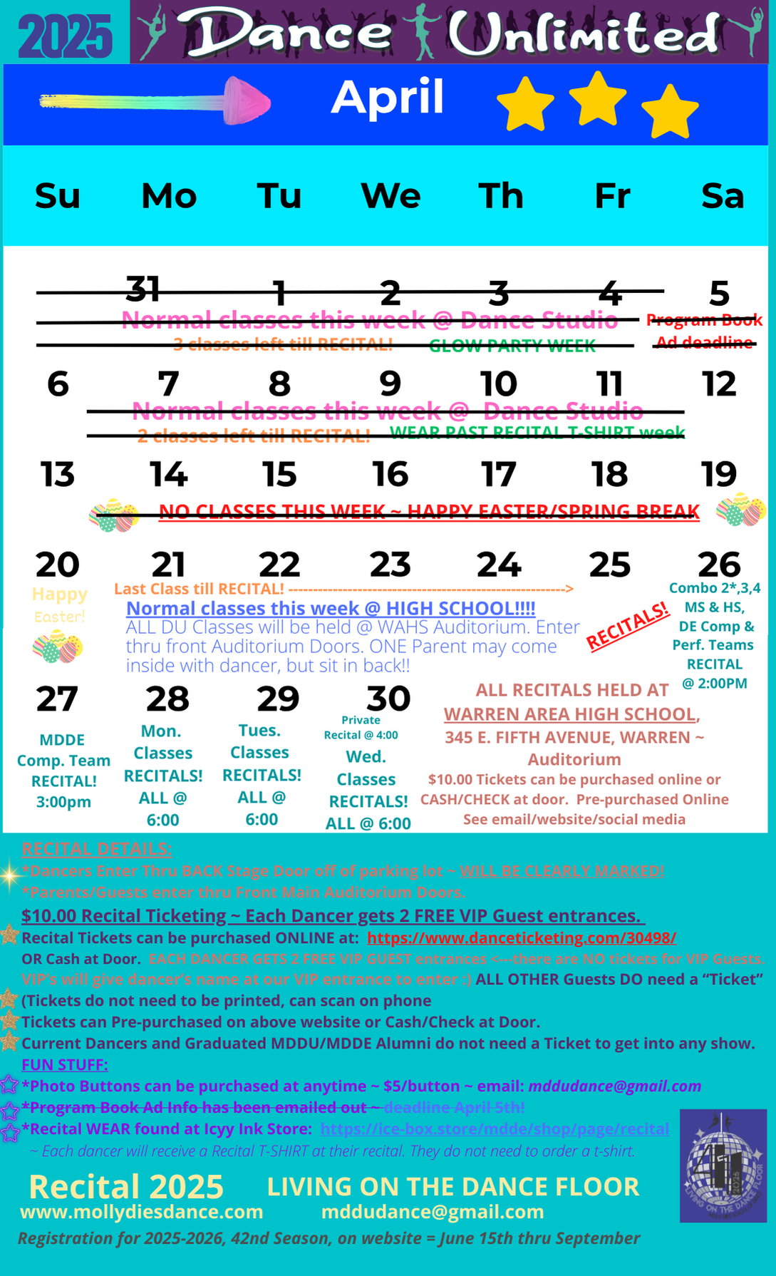 Program Ad = A beautiful, in color, keepsake full of dance class pictures, names, and personal ads. Order due strict deadline: Thursday, May 12th. Save money by creating your own! See "order form" link above.