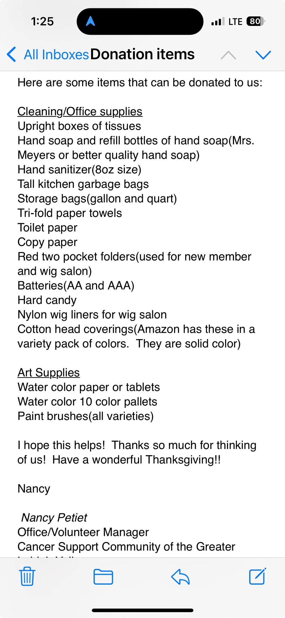 Finally, we are collecting donation items for the cancer survivor group. A screenshot of the items that can be donated is attached in this post. If you donate items, they do not need to be wrapped. Please message Silvia Dayan in Band if you have any questions.