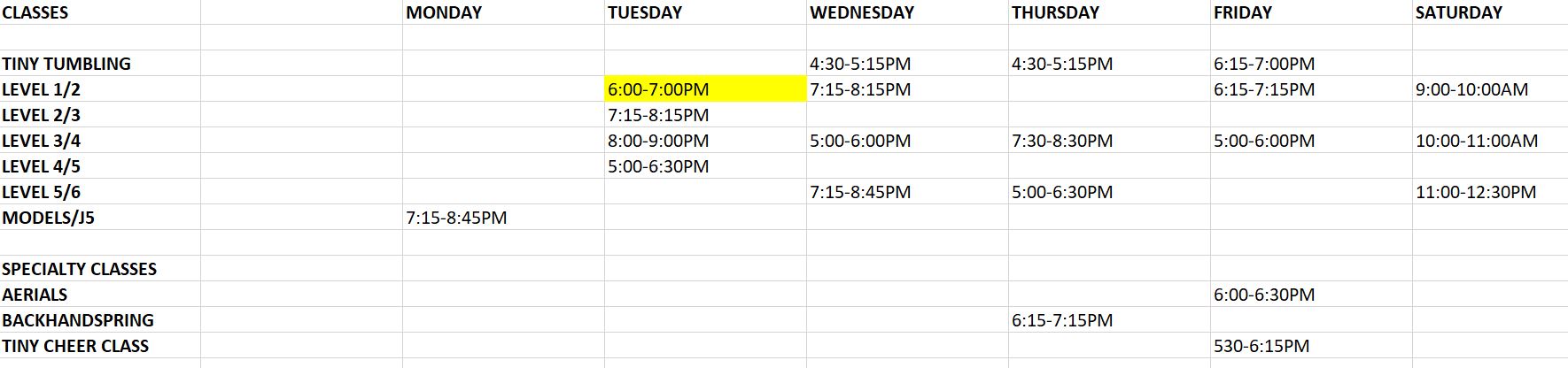 Below is the fall tumbling schedule currently in effect as of September 5th. Please register for your tumbling classes AFTER you have confirmed with Coach Dana the class has availability.