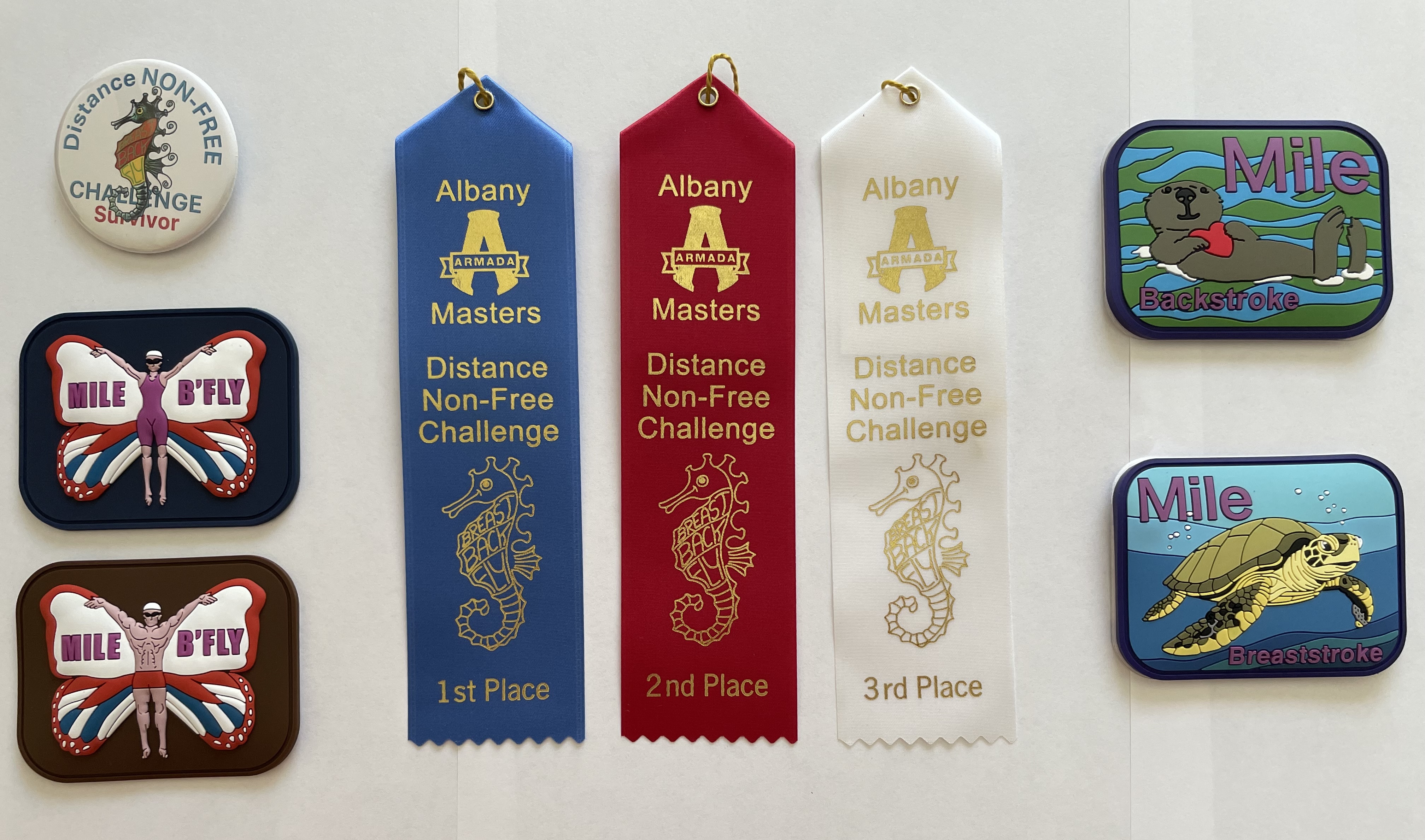 Unless they opt out, 1st, 2nd and 3rd place finishers in each category in each gender and age group (18-24 women, 25-29 men, 30-34 women etc.) receive a ribbon; all participants receive a “Distance Non-Free Challenge Survivor” button to proudly display on their swim parka, and ALL finishers of the 1650 fly, back, and breast, present *and past*, are eligible to receive a special Mile Fly, Mile Backstroke, or Mile Breaststroke patch. 1983-2019 finishers please contact the meet director, Leah Carroll, to receive yours. Patches are the same size as USMS Top 10 patches. Though they have adhesive, they are meant to be sewn on fabric such as your team swim parka.