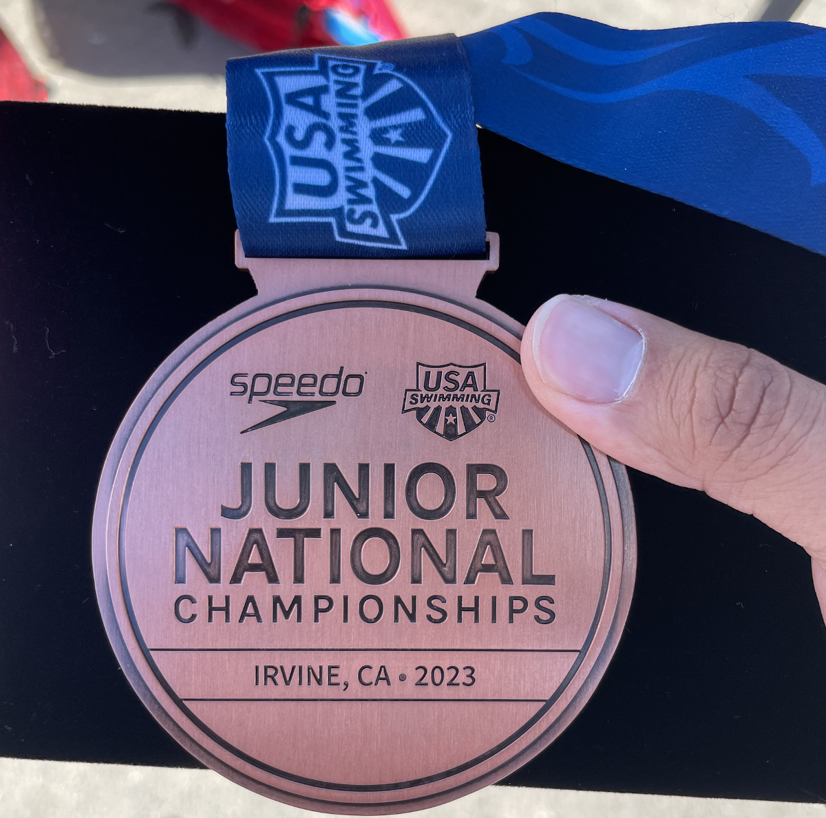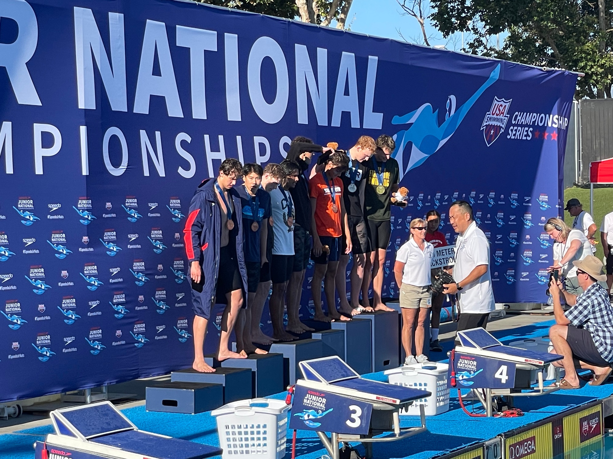 On the same weekend, our Cal-Berkeley committed swimmer, Edward Huang, raced his first Junior National Championships at Irvine, CA(He missed last year's due to COVID). At his best event, 100 M Backstroke, he got 55.99 and advanced to the championship finals(top 8). He finished the final in 7th place. He just missed the Olympic Trials Cut by 0.3, which will be his next goal to get it in upcoming long course meets.