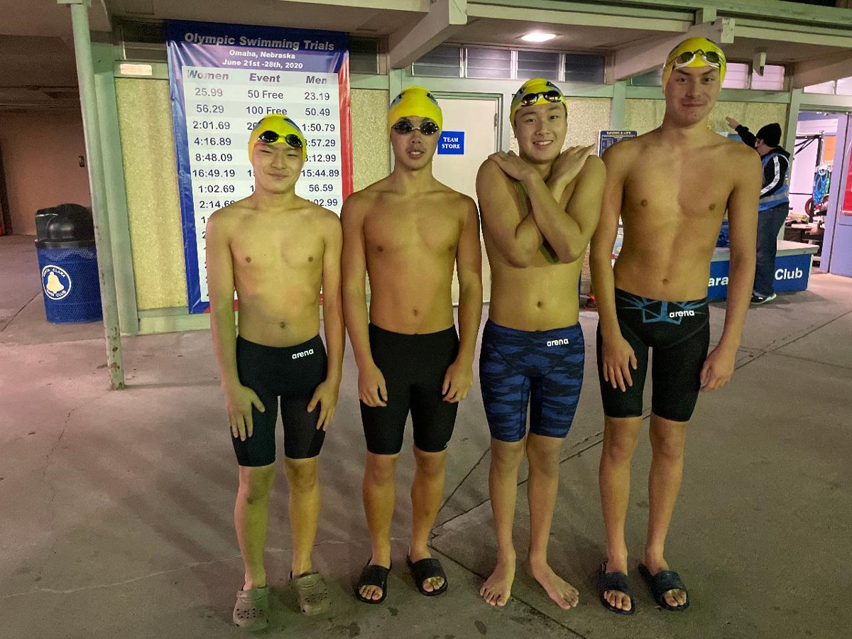 13-14 Boys Relay Team has Eric Meng, Justin Ely, Alex Wang, and Kevin Liu. They raced in 200 Freestyle Relay and 200 Medley Relay and placed 11th and 14th. Alex Wang and Kevin Liu were at the championship level meet for the first time. It was a great learning experience for them, and they all performed their best at the relay. Eric had three individual finals before relay events on each night's final. He still posted best times in relay and helped the team look strong at the meet. Justin posted a split of 22.18, the fastest split in the whole field. Way to go, boys!