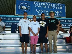 The Aquacowboys make their presence known at this year's prestigious Santa Clara International swim meet. Andrew Hayes, Nina Hayes, Evan Carlo were qualifiers. Andrew competed in the 50 and100m free, 100m fly, 100m and 200m back and 200m IM. Nina competed in the 50 and100m free, 100m fly, 100m and 200m back, 100m breast and 200m IM. Evan competed in the 100m fly, 100m and 200m back and 200m IM. They are pictured with their coach Alex Silver. The SC International meet hosted Olympians such as Michael Phelps, Rebecca Soni, Ryan Lochte, Cullen Jones, Natalie Coughlin and many of the fastest swims in the world.