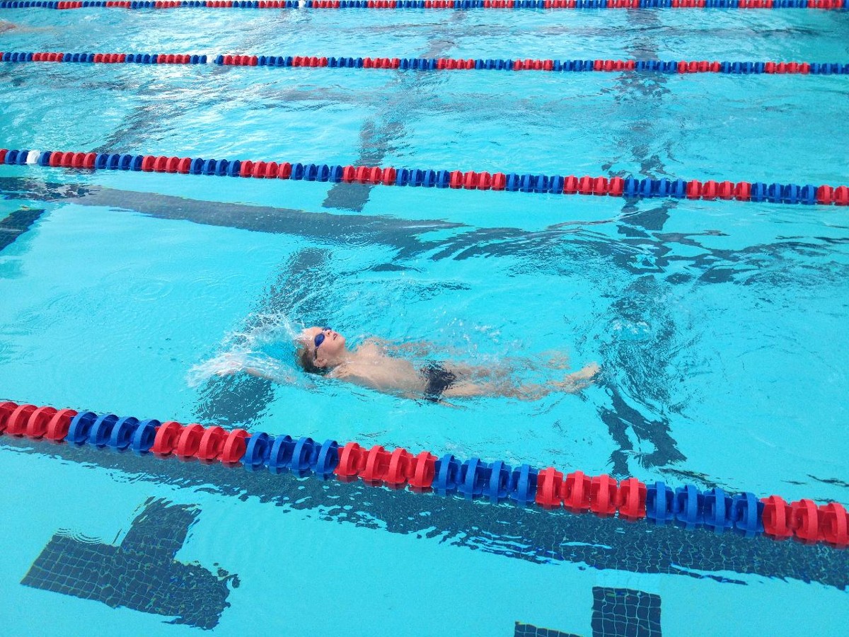 Pictured is Kyle R. (6) during his 100 backstroke at his first long course meet.