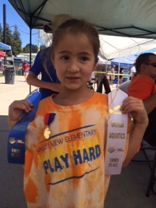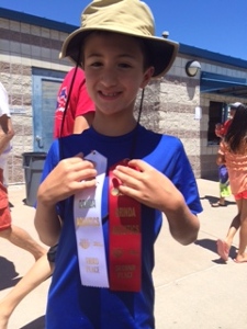 From the left is Lucia A. (7) and Pablo A. (10) competing for their first time in long course pool and proudly holding on to their ribbons awards.