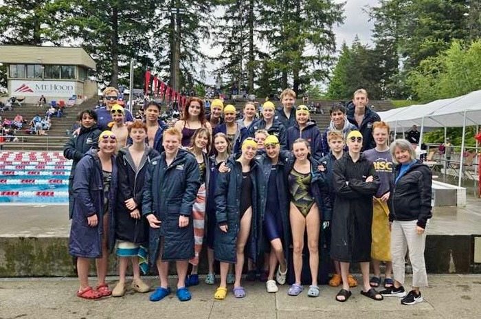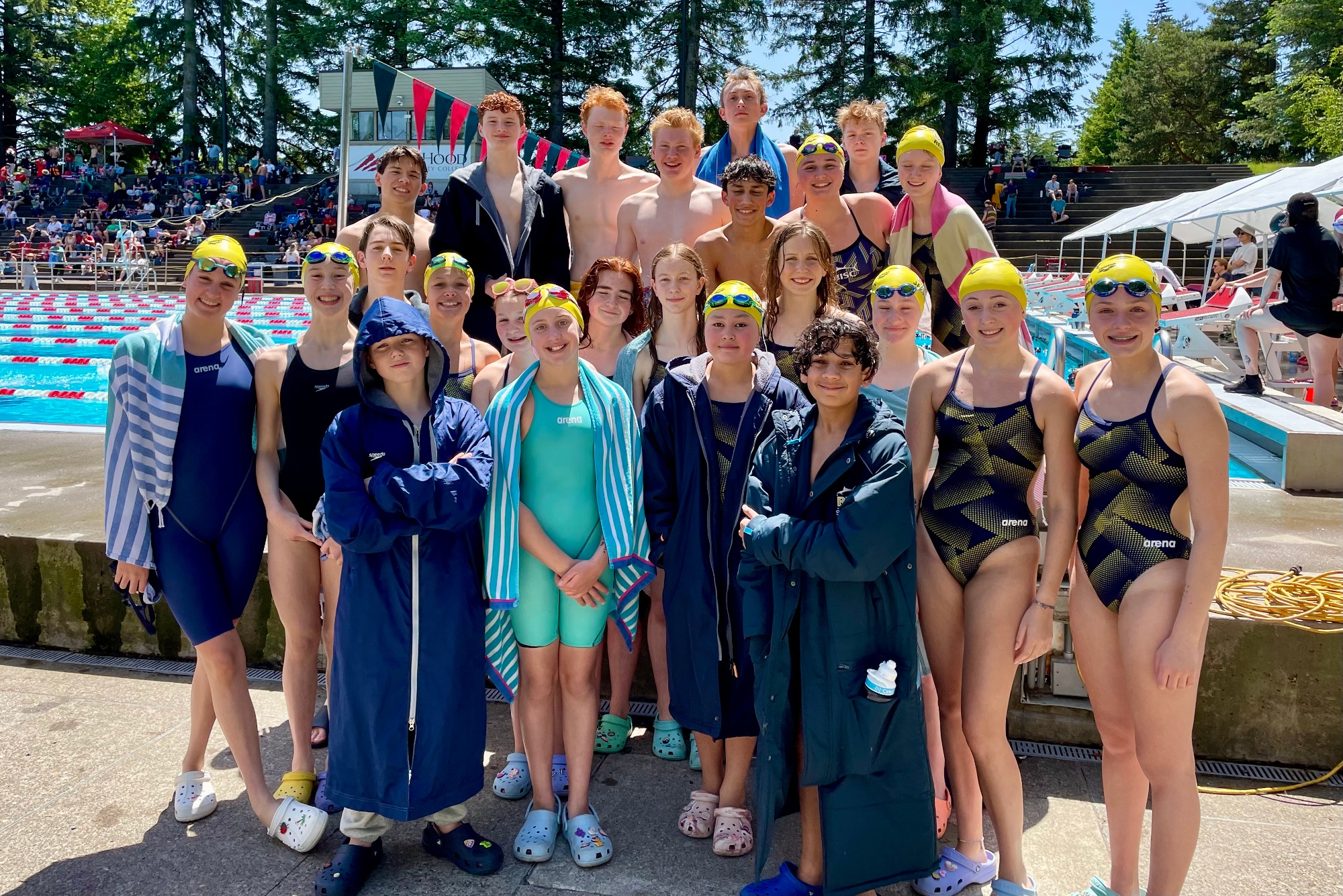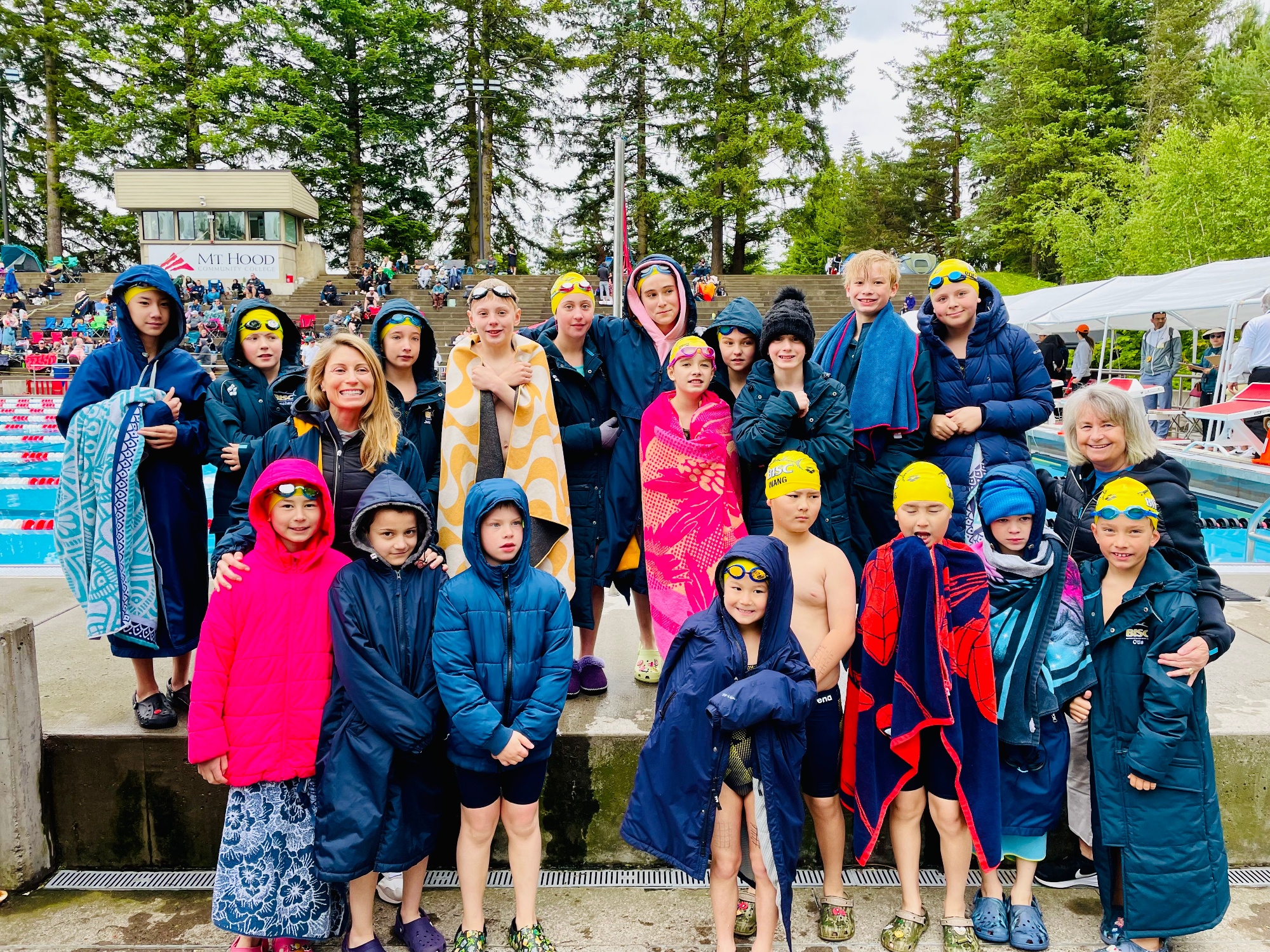 Big Wave Decathlon: Travel Meet to Gresham, Oregon 5/24-5/25: 52 swimmers attended and celebrated swimming outdoors in a long course pool. Day 1: sunny & warm, Day 2: cloudy & colder with some sunbreaks in the afternoon. Our swimmers came prepared with sunscreen, canopies & swim parkas and embraced their first outdoor experience of the season. There was a geese family that really wanted to swim at the meet that provided excitement on Day 2’s afternoon session. The swimmers showed true grit when the weather shifted and bundled up & kept swimming. Some brought home a new cut time, a best time and or a ducky for winning their heat. Anyone swimming a 200 or more were entered with a converted LCM time meaning the computer took your best yards time and applied a formula to that to create a LCM time. These converted times are notoriously fast and our swimmers stepped up and raced their best. If you are wondering why they were not reaching those times it was because they had not raced that event yet in a long course pool and it was an estimation of how they would race. We felt the meet was well worth the drive down. We were impressed with how well the swimmers did in various weather conditions and staging themselves. “We can do hard things”. Swimming all 10 events to get their decathlon bag tag were: JJ Borovsky, Avery Britt, June Brown, Willam Browning, Rylee Dupont, Lena Everett, Jonathan Fort, Chloe Frederickson, Leland Hilgers,Tessa Hurguy, Surya Jain, Aiden Johnson, Fiona Livingston, Wyatt Livingston, Olivia Longridge, Wyatt Majors, Louis McKibbin, Aria Michael, Mika Moskin, Tej Pal, June Reeves, Lily Rehder, Skylar Richardson, Spencer Slowik, & Harrison Younger.