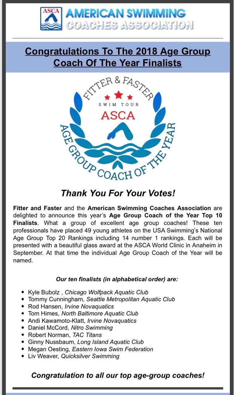 Coach Tommy Cunningham of Seattle Metropolitan Aquatic Club is a top ten finalist for The Fitter and Faster/ASCA Age Group Coach of the Year Award! They will be deciding at the World Clinic Awards Banquet on September 6th for who will win.