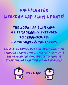 Tuesday/Thursday noon lap swim extension! We will be trying out this extended 12-3:30 time through Thanksgiving, then will evaluate demand and ability to staff the swim moving forward. Hope to see you there!