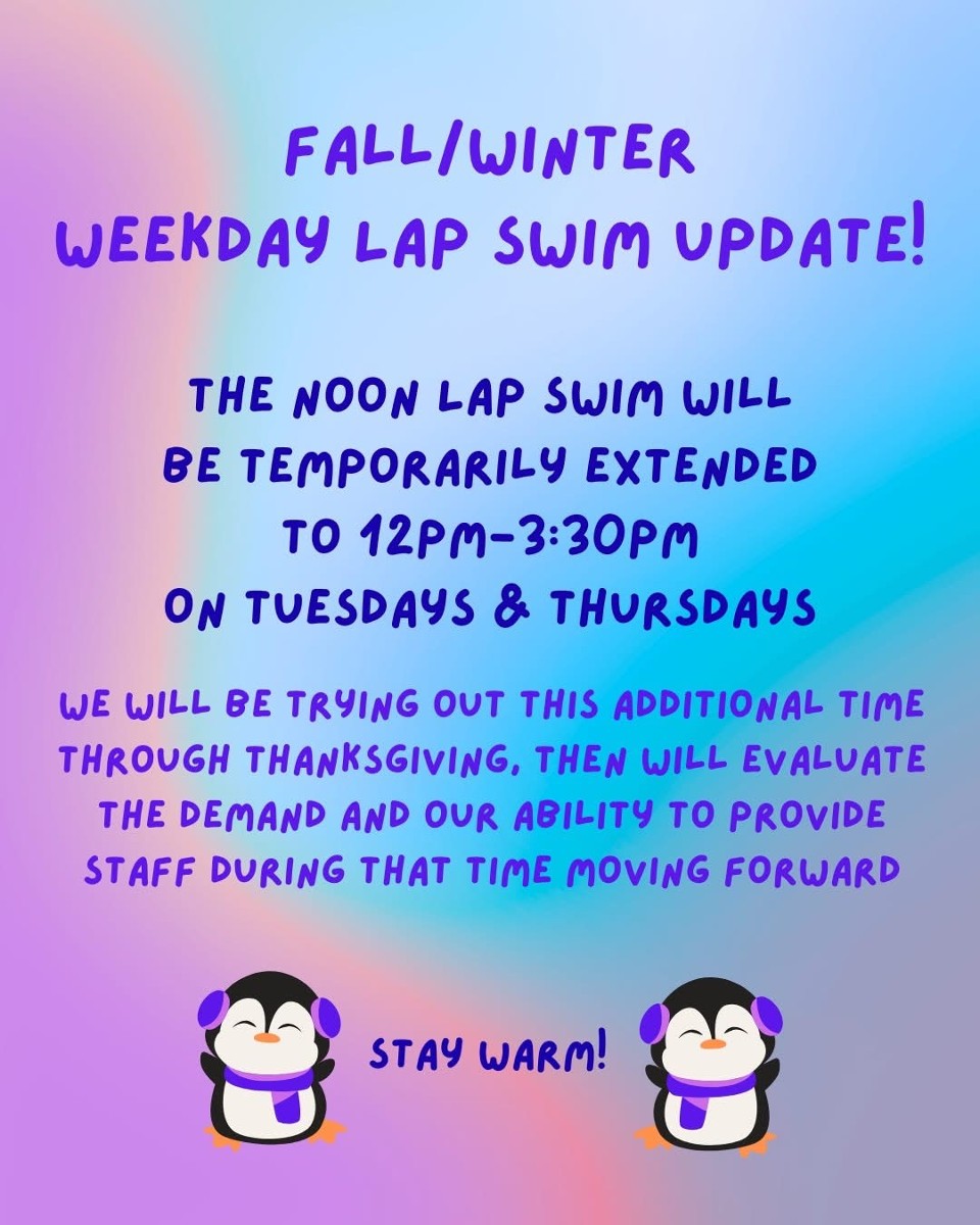 Tuesday/Thursday noon lap swim extension! We will be trying out this extended 12-3:30 time through Thanksgiving, then will evaluate demand and ability to staff the swim moving forward. Hope to see you there!🐧🍂