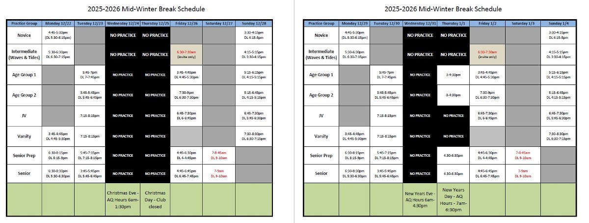 Holiday Practice Schedule β As a reminder, here is the schedule for the holiday break. If you have planned absences, please confirm with your coach.