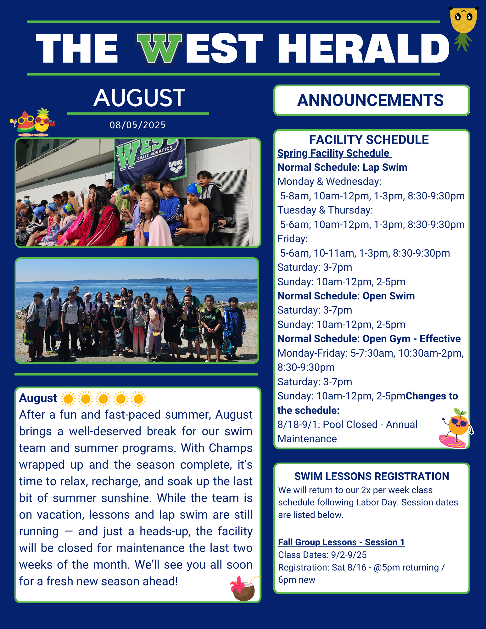 Welcome to August and congratulations to our competitive swimmers, both Club and Recreation Teams on successful seasons and a job well done! Club Team finished in 10th place at 13 & Over Championships and 8th place at 12 & Under Championships. The WEST Summer Team finished in 5th place at NCSSL Championships and we have just one more full week of swim lessons and lap / open swim before closing down for our annual maintenance!