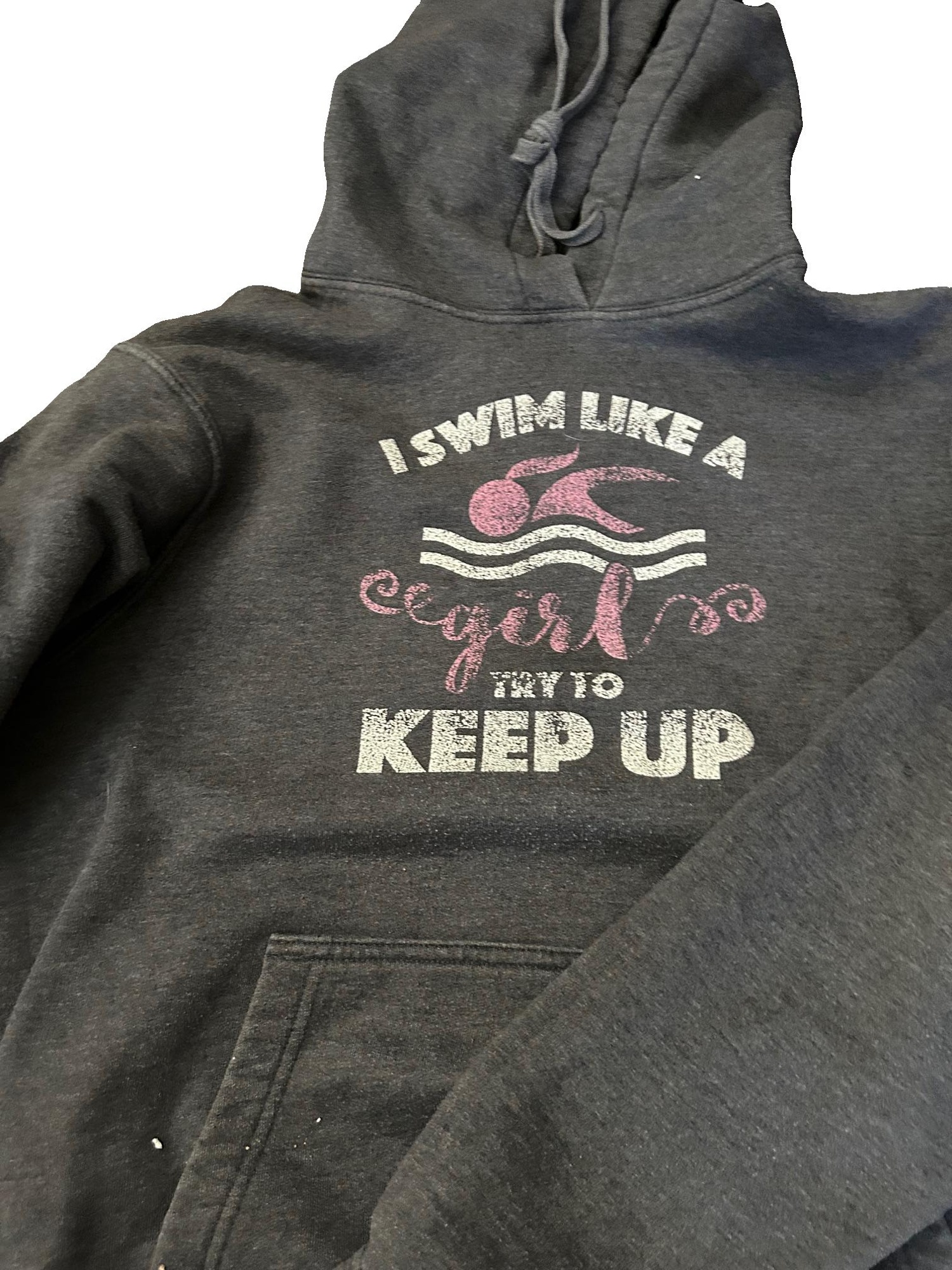 Gray "swim like a girl hoodie" left behind in team area at a swim meet