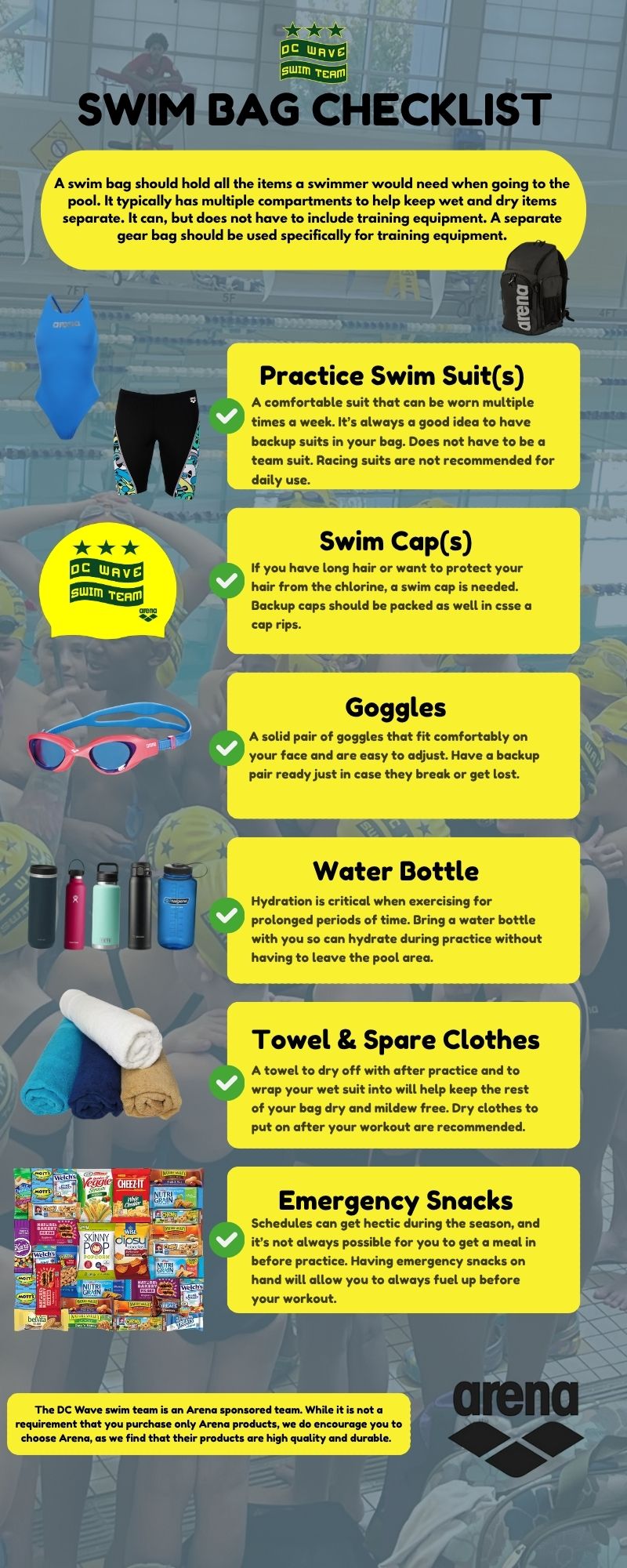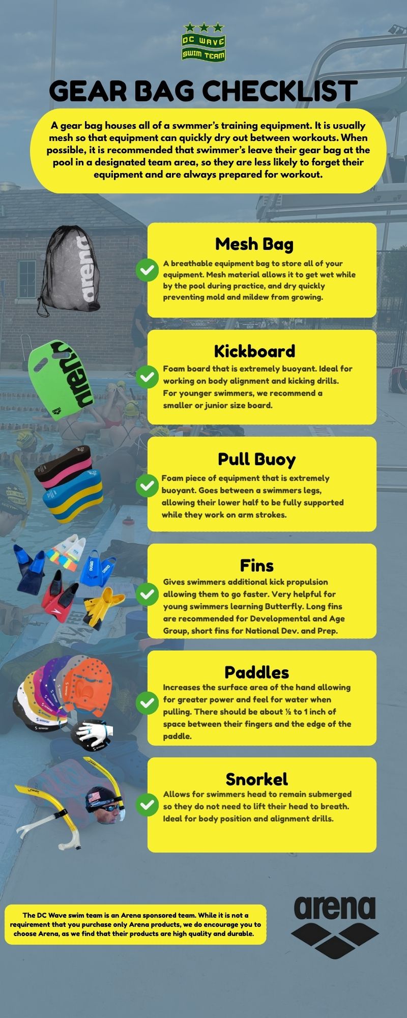 As we begin to close out the 2024-2025 swim season, now is an excellent time to do an inventory of your swim bag and gear bag to find out what equipment is missing, broken, or no longer fits. Below is a list of required equipment each swimmer should have so they are fully prepared workouts and can maximize their practice time next season.