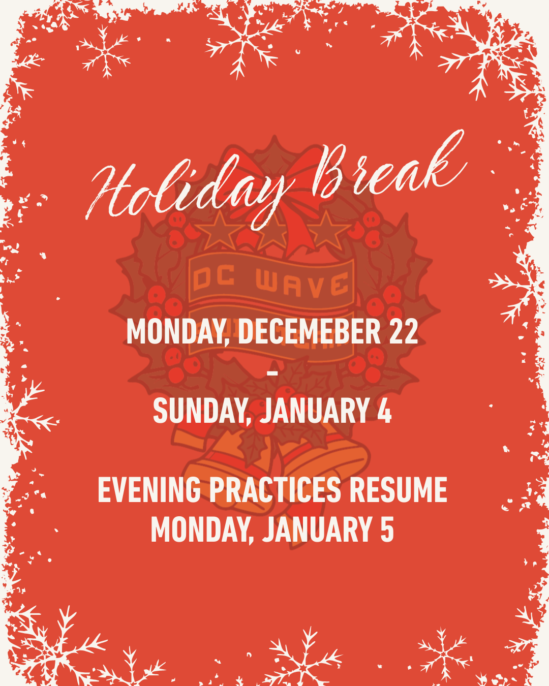 As we close out the 2025 calendar year, we would like to wish all of our DC Wave families, swimmers, and coaches happy holidays and a happy new year! Together we have accomplished a great deal - from hosting swim meets, breaking records, accomplishing goals, and creating lasting memories.