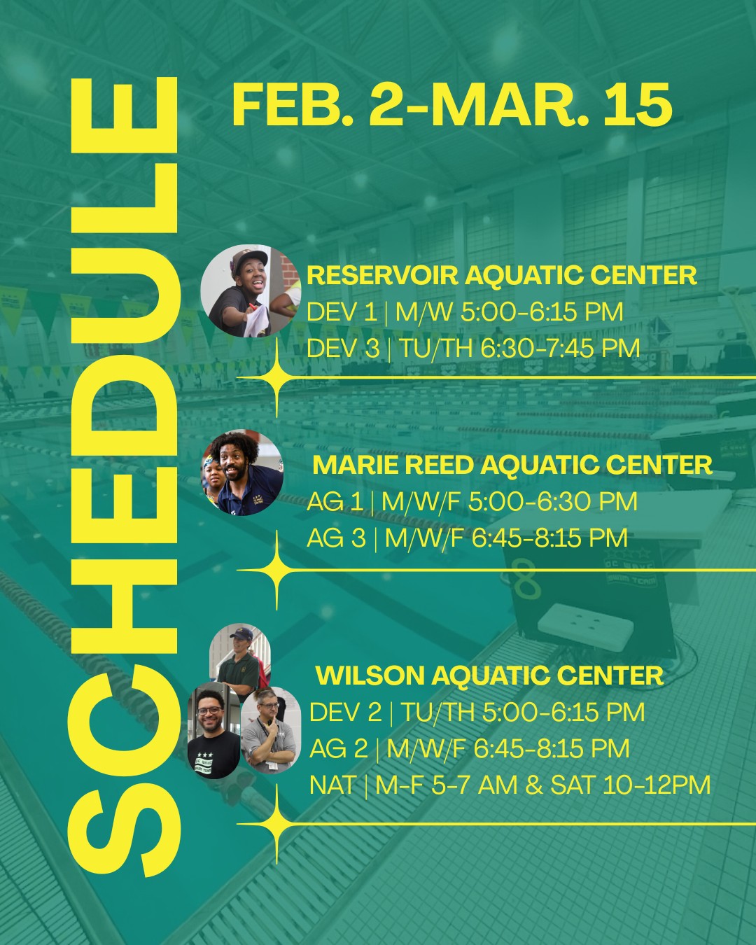 Additionally, this fiscal year Takoma's locker rooms will receive a full rennovation. This additional work is scheduled to last up to a month, and will take place after the Black History Meet. Because of this scheduled work, Takoma practices will need to be moved during the month of February and early March. A temporary schedule is available below. Takoma practice groups will be reloacted to the following facilities: