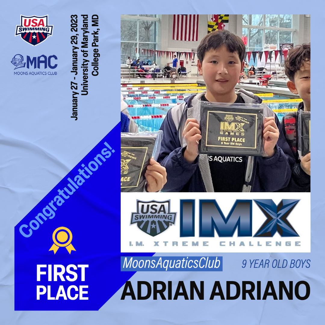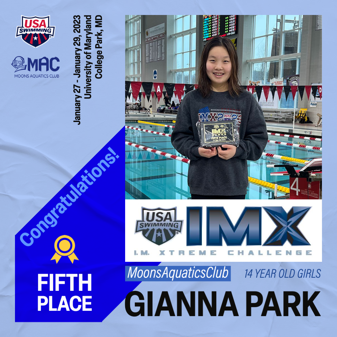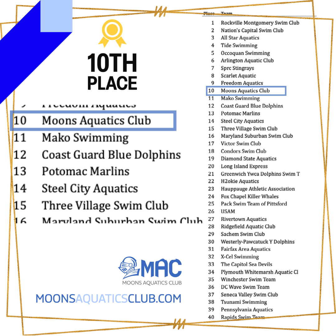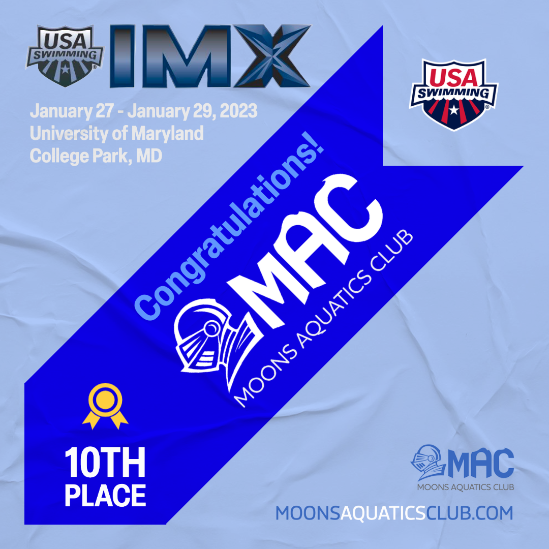 Our qualified swimmers competed at the 2022-23 USA Swimming IM Xtreme Games-NE on Jan 27-29 at the University of Maryland, College Park, MD. We at Moons Aquatics Club applaud the effort and dedication of the swimmers that participated. As a result of all the swimmer's fantastic races, Moons Aquatics Club ranked 10th in North East at IMX 2022-23! Thank you MAC families for the support!