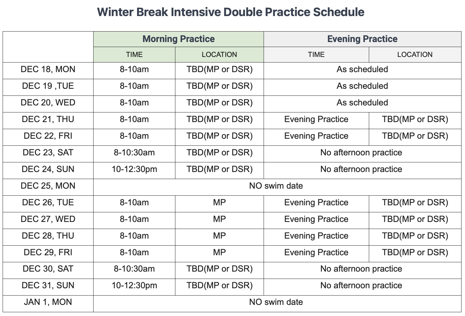 The Winter Break Intensive Training is available to Swim Team with additional lesson fee. Some swimmers in Mini team can be join with coach's approval. Please note that the exact location for the training sessions will be determined in early December. We will keep you updated, and once the location is finalized, online registration will be made available.