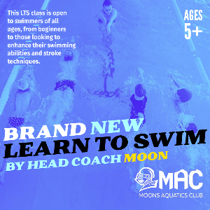 Coach Moon's LST class We are thrilled to announce that Moons Aquatics Club's esteemed Head Coach, Joung, is excited to introduce our brand-new Learn To Swim (LTS) class! Whether you're a beginner taking your first strokes or looking to refine your swimming skills, this is the perfect opportunity to make a splash and become confident in the water. This LTS class is open to swimmers of all ages, from beginners to those looking to enhance their swimming abilities and stroke techniques. Small class sizes(6 swimmers max) for individual attention Location:...