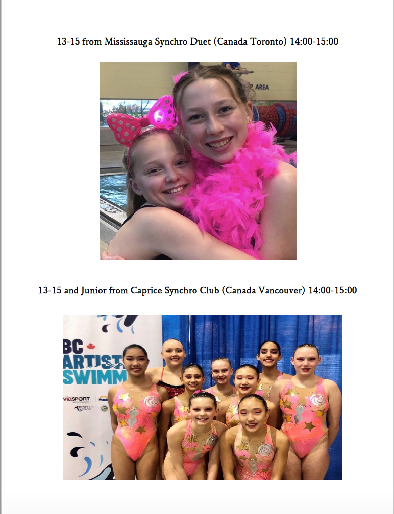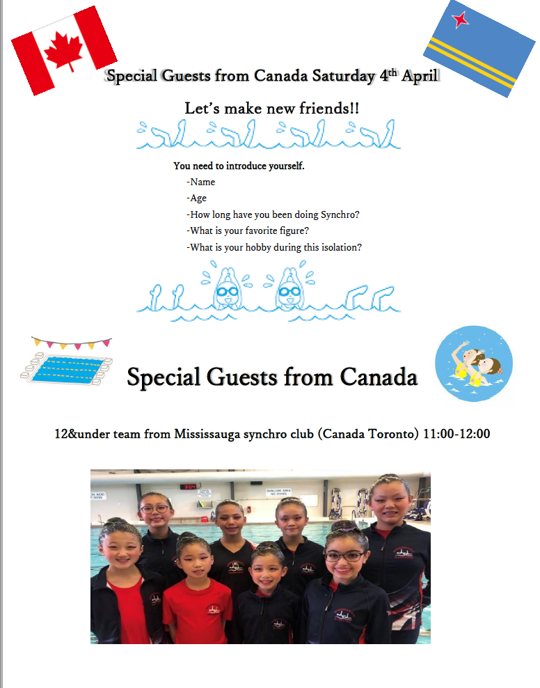 Special Guests from Canada 12U, 13-15 and Junior teams from Mississauga Synchro Club. Team 12U athletes need to prepare the following questions to introduce themselves: What is your Name? Age? How long have you been doing Synchro? What is your favorite figure? And What is your hobby during this isolation.