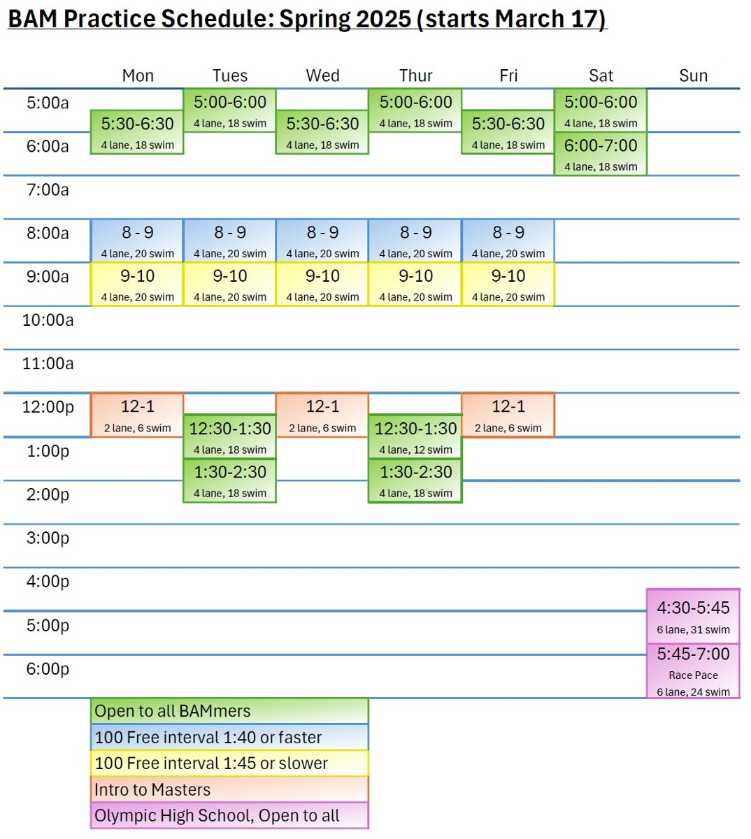 Reminder: 8:00a practices are for fast swimmers (100 Free on 1:40 interval or faster), and 9:00a practices are for not-as-fast swimmers (100 Free on 1:45 interval or slower).