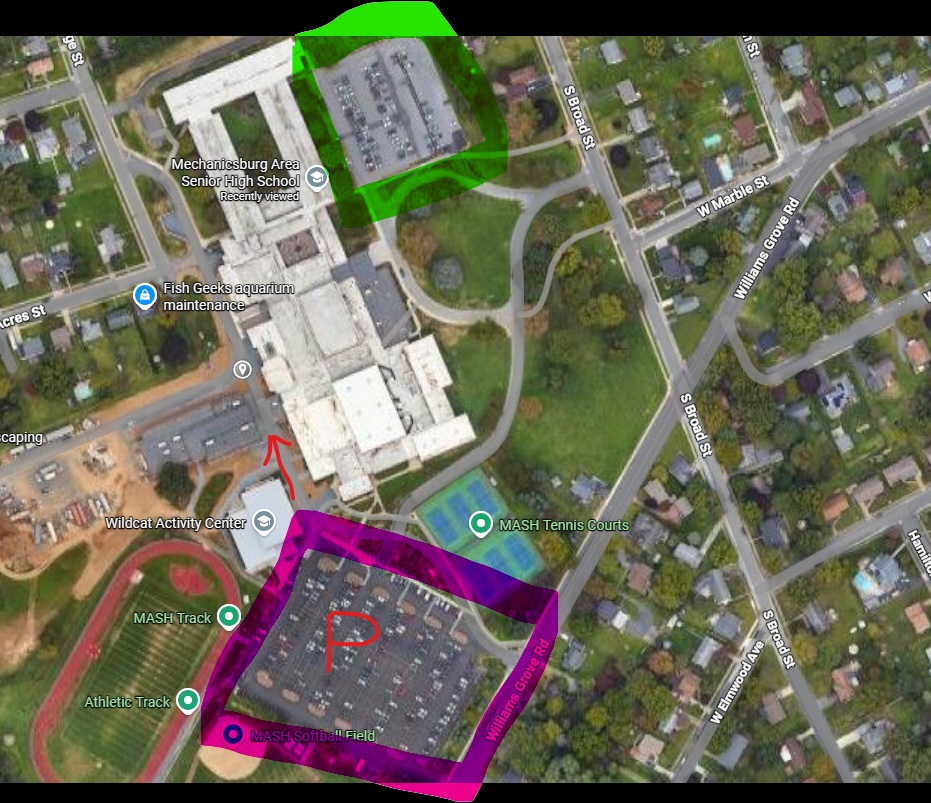 CPAL Swimmers and Families: Park behind the high school (in between the tennis courts and athletic track) in the purple square.