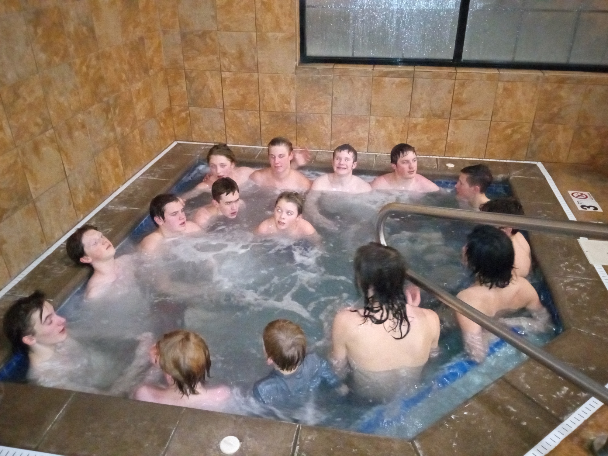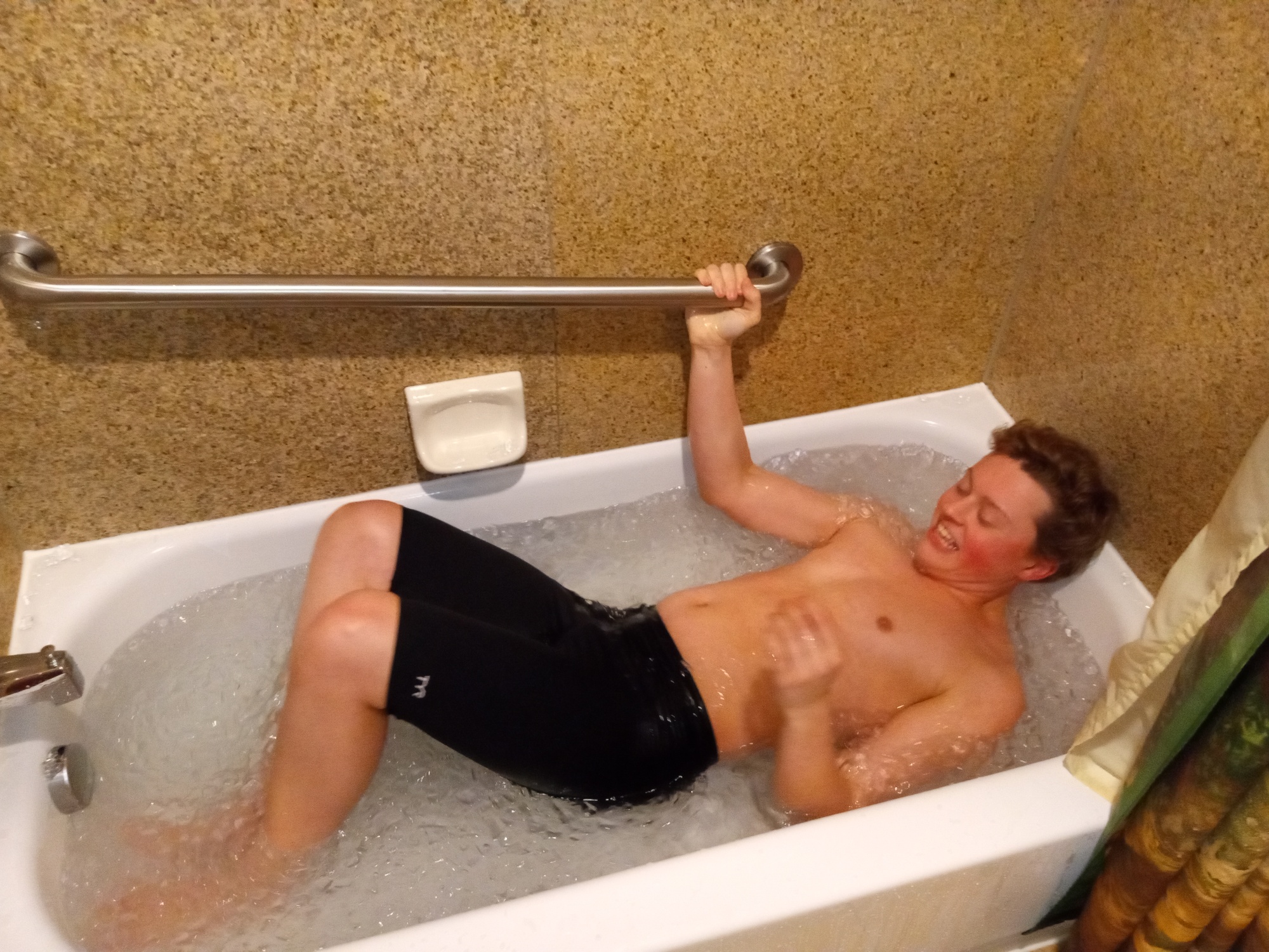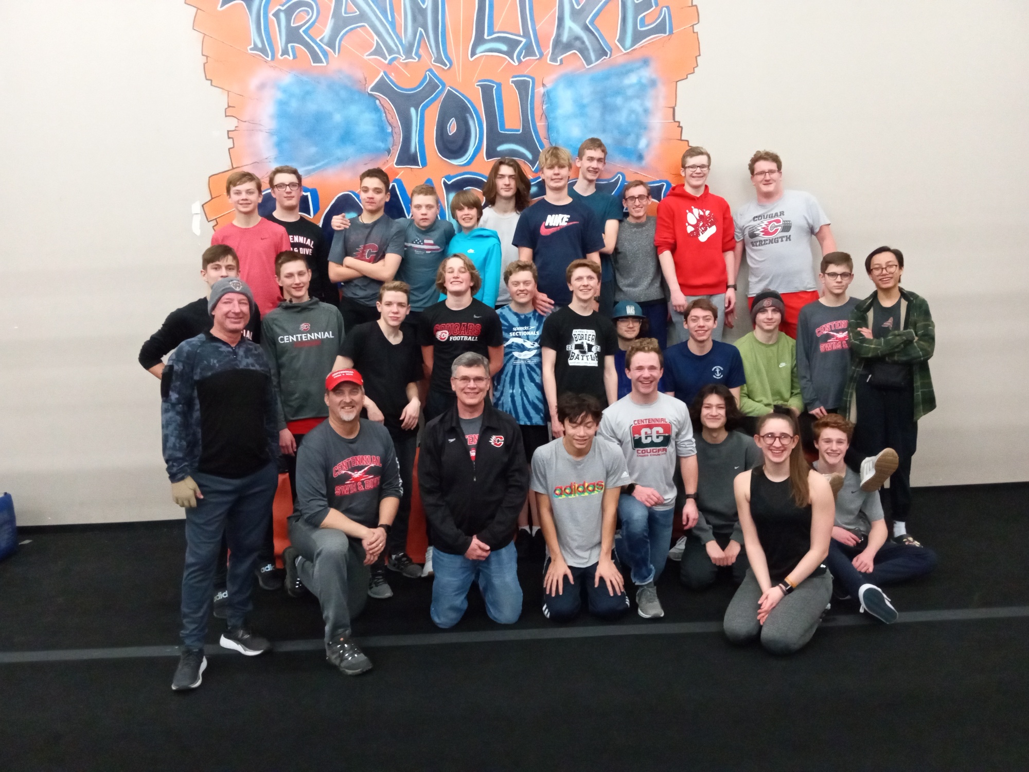During the four-hour bus ride back to Blaine, MN, Head Coach Pete Crawford told the team that this invitational was placed in the schedule as a team bonding and fun experience. He asked his athletes if this goal was met and was given an overwhelming “YES” by the swimmers. Besides the excitement of competing against North Dakota and western Minnesota athletes, the Centennial Swimming Booster Club sponsored event included travel in a coach bus, a pizza dinner and an evening at the Ninja Academy for an hour of Ninja Warrior obstacle training. Many of the team members also spiced up the overnight meet experience by plunging themselves in a bathtub full of ice and then dashing to hotel’s hot tub to regain their lost body heat. How could this not be fun!