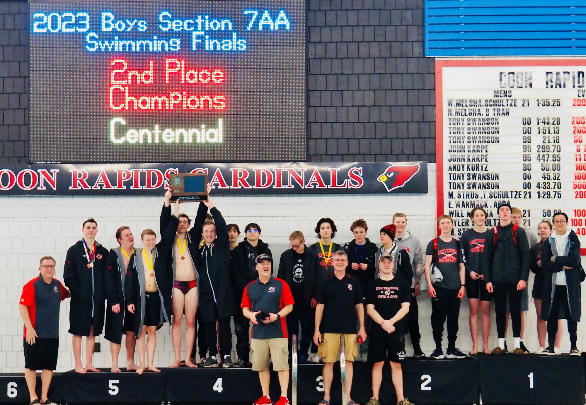 Other Centennial medal winners at the section tournament were Ben Condon (200 Freestyle, 100 Freestyle, 400 Freestyle Relay), Benno Schubauer (200 IM), Joe Murray (50 Free, 200 Freestyler Relay) George Atkinson ( 100 Butterfly, 100 Backstroke, 400 Freestyle Relay), Garrett Clark (500 Freestyle), Charlie Bryant (200 Freestyle Relay), Manny Poscher (200 Freestyle Relay), Talen Greeson-Stromoen (200 Freestyle Relay), Caleb Cregan (100 Backstroke), Alex Larkin (400 Freestyle Relay) and Max Scheurer (400 Freestyle Relay).