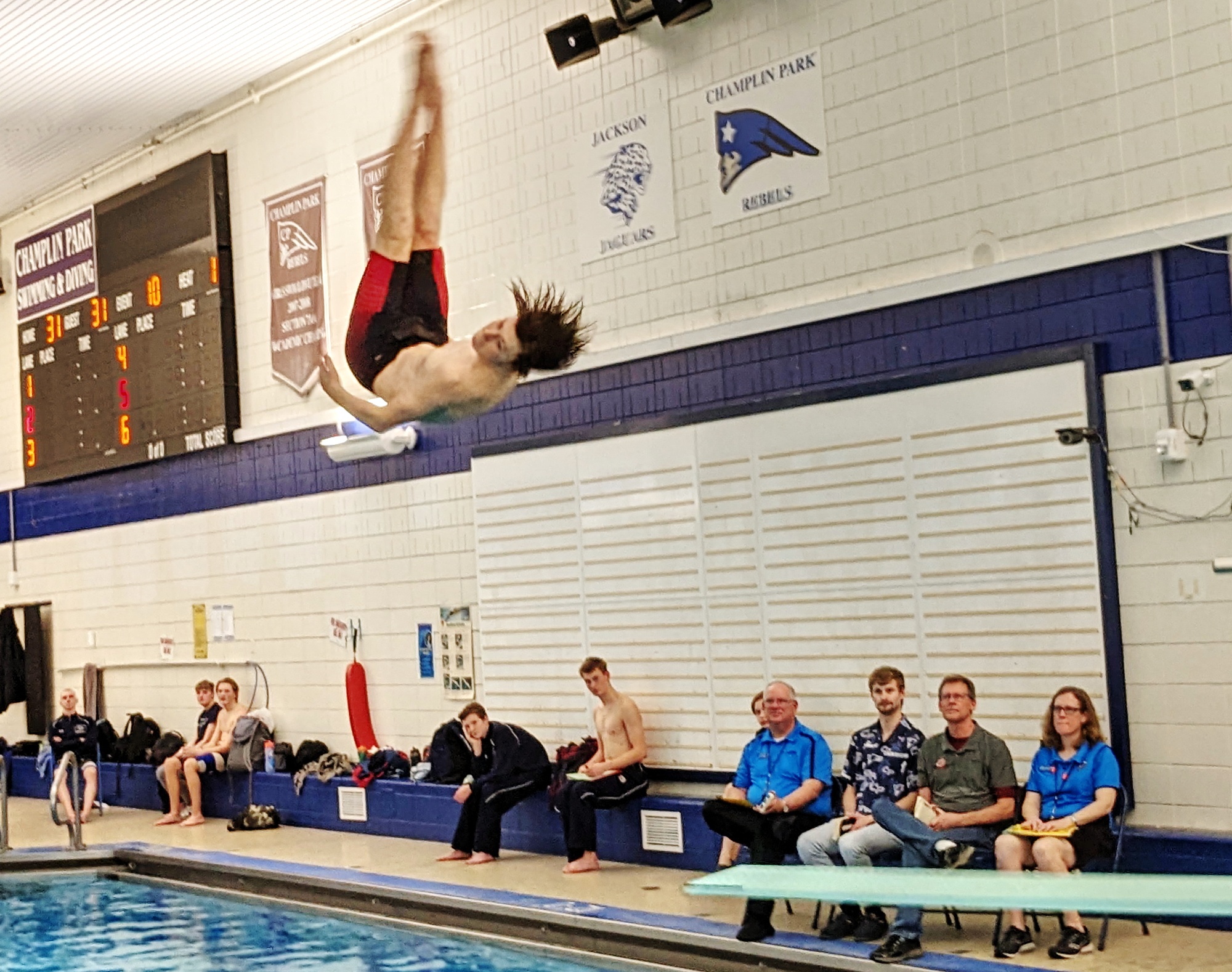 Before the start of the January 25, 2024 meet with Champlin Park, Head Coach Pete Crawford told his coaching staff that it looks like the Cougars should win the meet, but there could be surprises. Crawford stated that “my past experiences with the Rebels is that they often pull out hidden talent when we swim them or their known talent often swim exceptionally well against us”. With this meet being Champlin Park’s Senior Night, the Cougar Coaching staff braced itself for the unexpected.