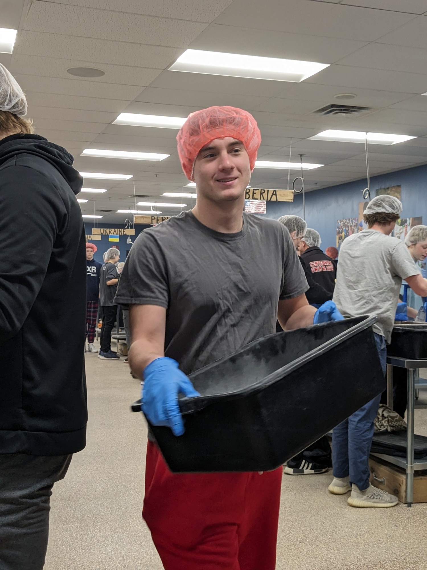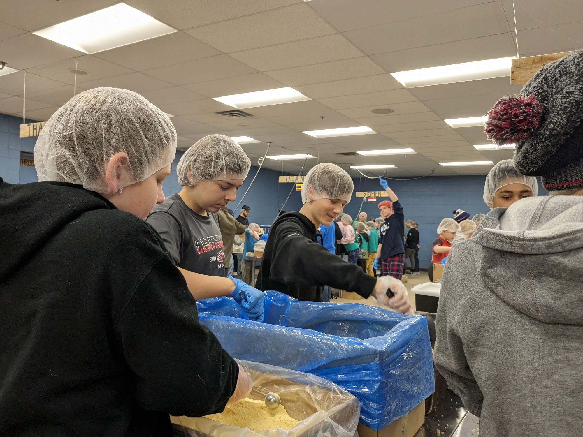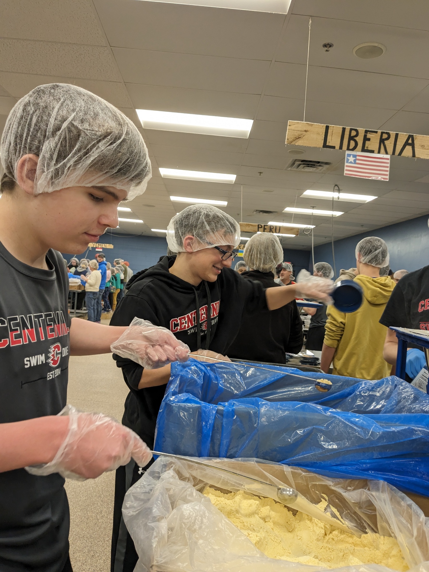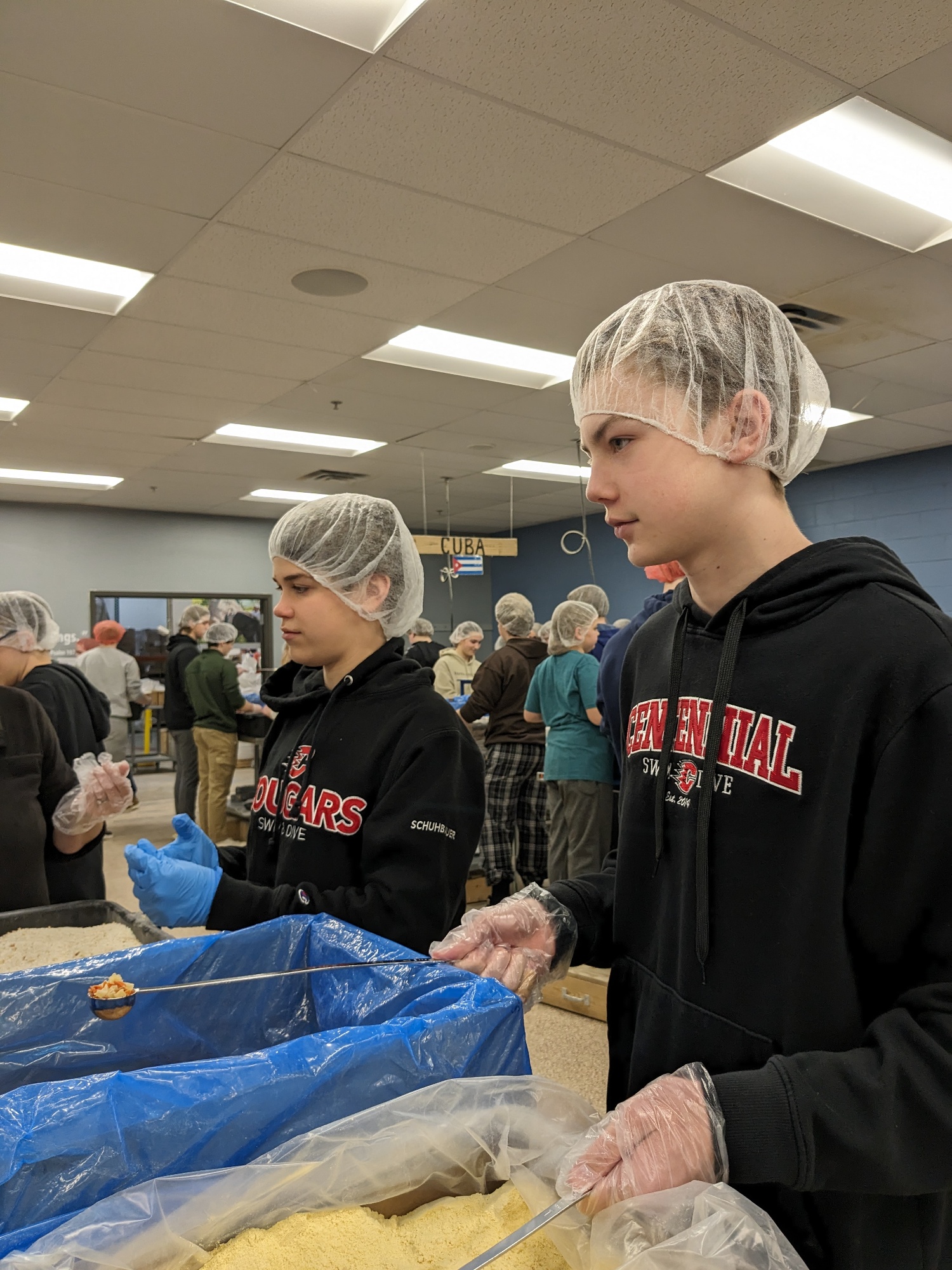 The Centennial Boys Swimming and Diving Team helped feed hungary people in Haiti on January 27, 2024 by bagging and packing 11,448 meals at Feed My Starving Children in Coon Rapids. Besides a fun afternoon volunteering at the nonprofit Christian organization, the team's coaching staff and parent chaperons agreed that the service project was great bonding event for the Cougar athletes. More importantly, Centennial's swimmers and divers put together enough meals to feed 31 Haitians for one year.