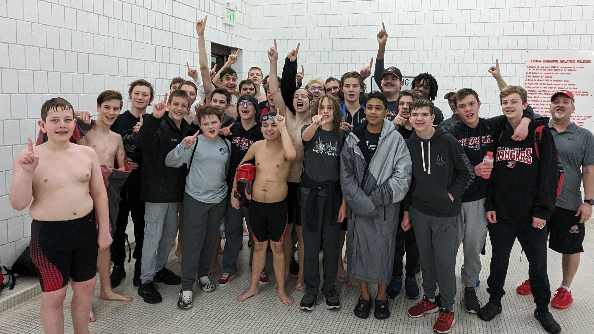 More important than the win, the Cougars’ success can be measured by the fact that 81% of their individual swims resulted in personal best times. Assistant coach Kevin Setterholm was extremely happy with these results. Setterholm was heard telling an Andover coach at the conclusion of the meet that “I knew that Cenennial was going to perform well today, but I was shocked at how big our time drops were in so many of the races. There really isn’t a better way to end a season than seeing most of your boys cheering with raised fits as they looked at their times posted on the score board after their race.”