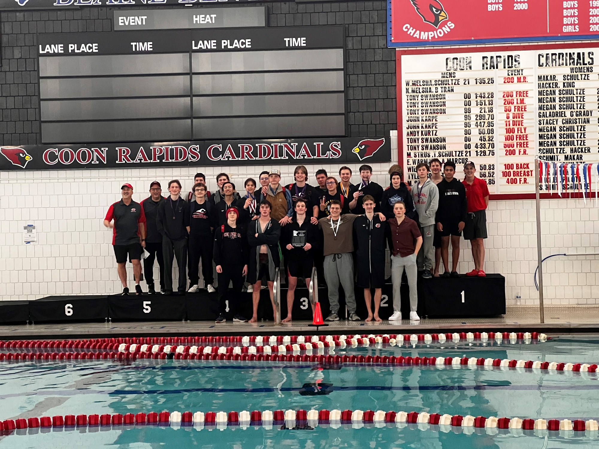 An all around strong showing by the boys this week! Come cheer on the Cougars here at Centennial's pool for Parent Night this upcoming Thursday when the Cougars take on the Osseo Orioles at 6PM and at True Team State this coming Saturday at the UofM's Aquatic Center.
