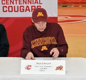 Senior Captain Max Scheurer participated in a signing ceremony with the University of Minnesota – Twin Cities on February 1, at Centennial High School. The ceremony was especially memorable because Scheurer is the first Centennial boys’ swimmer to commit to swim for a NCAA Division I school. Max’s competitive swimming career started when he joined the Centennial boys swimming team as an eighth grader. He chose to participate in the sport because he had a few friends that were Centennial swimmers and he was looking for something to do after...
