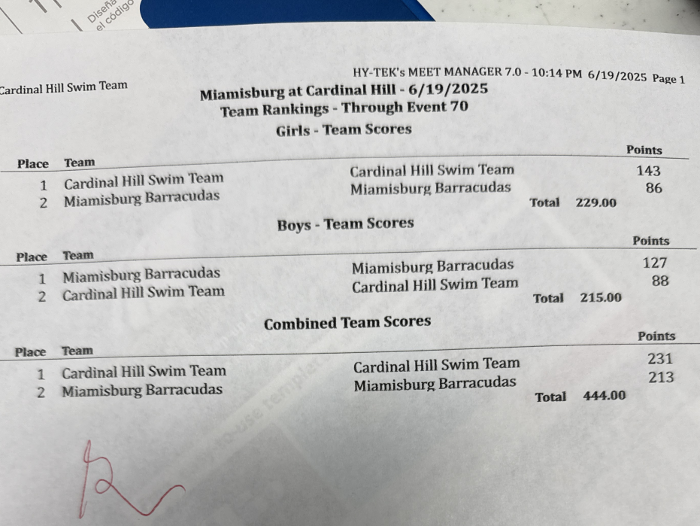 Coach Dylan will be sending out official results, but great job tonight Cardinals! We won the meet tonight! See ya tomorrow!
