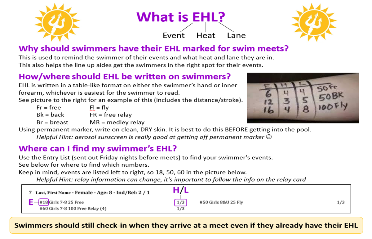Ever wonder what EHL means and why your swimmer has it written on their arm during check-in? Or where you can get that information for your swimmer each week? Check out the attached! Go Sundevils!