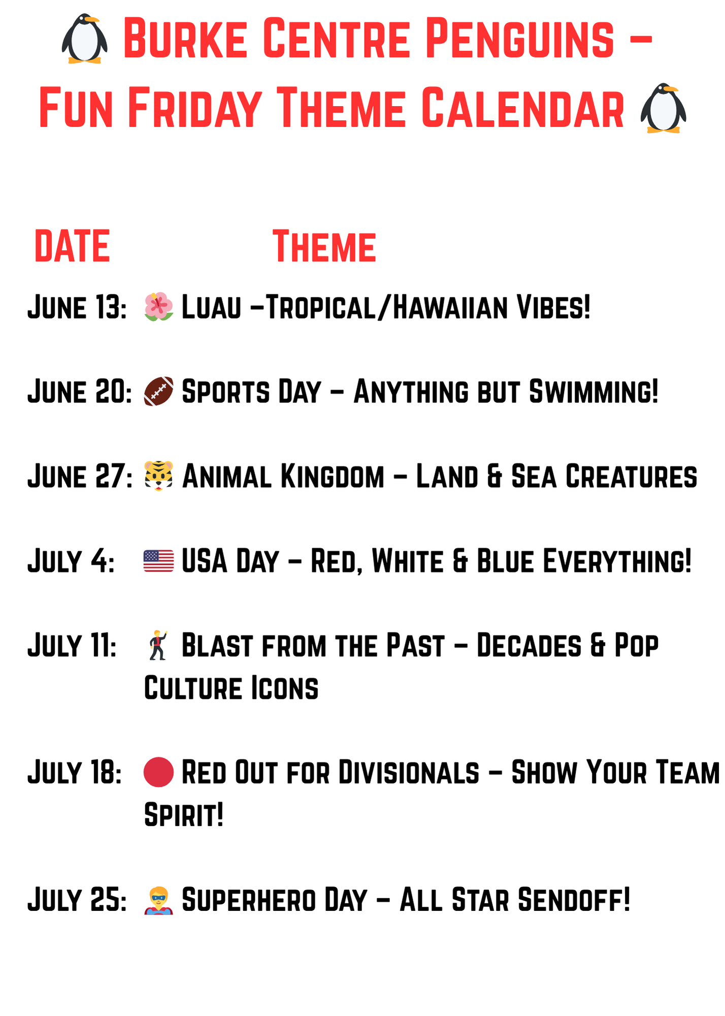Fun Fridays: Fun Friday themes will apply for the WEDNESDAY meet prior to and the SATURDAY meet following each FUN FRIDAY! More information to come next week!