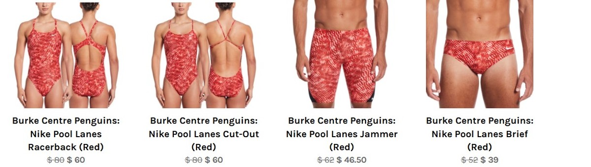 Our 2025-2026 team swimsuit is the Nike Pool Lanes pattern in Red. It is available in two different female cuts, a brief, and a jammer. These suits do NOT have a BCP logo on them.