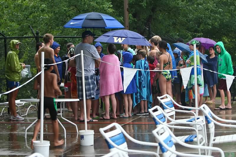 Always report to the pool for practices and meets, despite weather conditions (within reason) or unless you have heard otherwise. Precautions are taken for lightning and when conditions call for moving swimmers to safety.