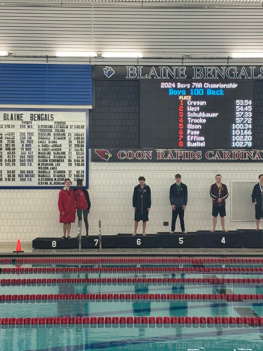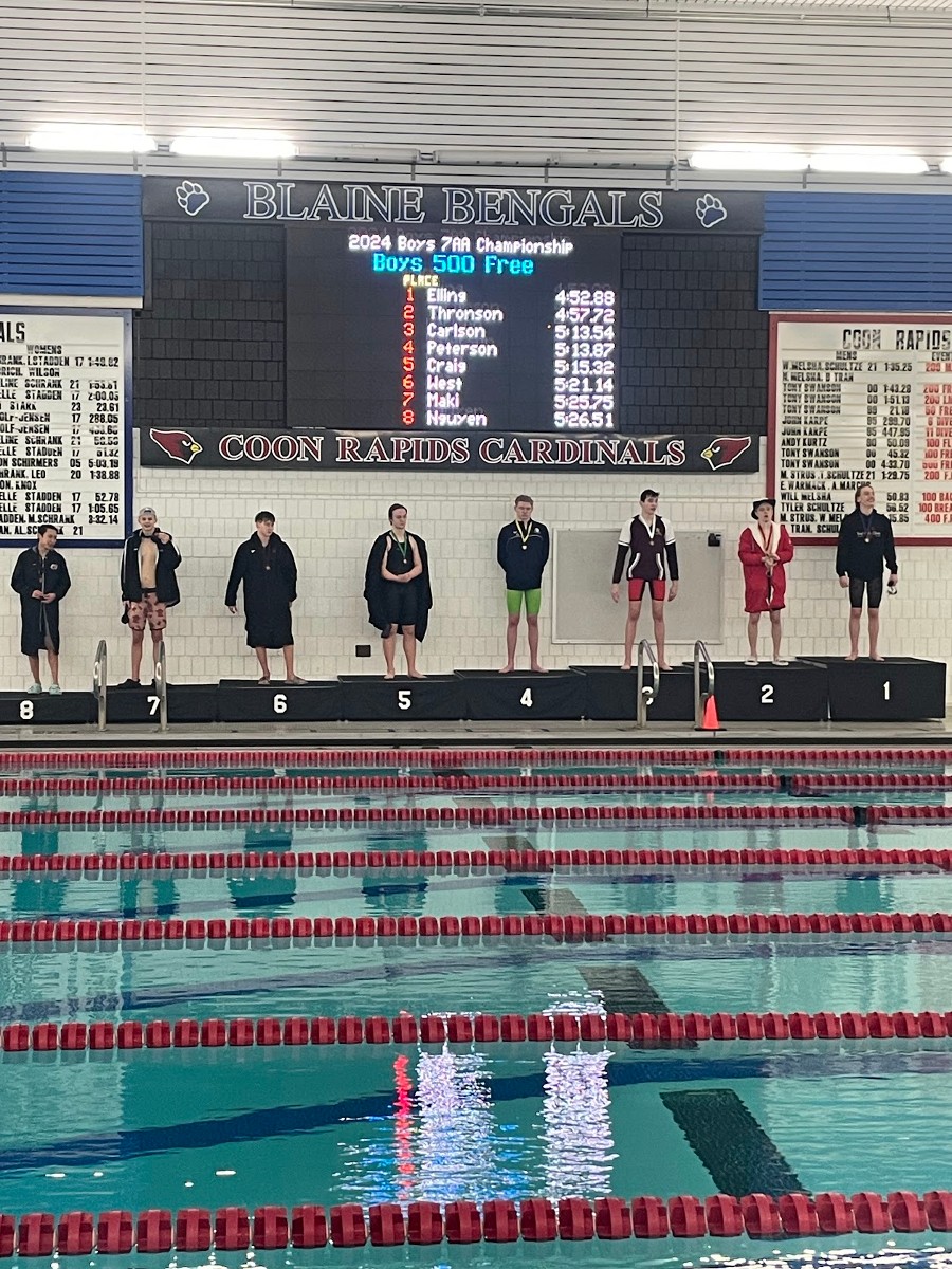 The Coon Rapids Boys' 2024 Sections Team took 4th Place at the 7AA Section Championships this weekend! We entered the competition with the smallest team and managed to beat out 4 other schools. Mitch Thronson came in 2nd place in the 500 Freestyle, qualifying for the State Meet, held on March 1st at the UMN Aquatic Center. Congratulations Mitch!